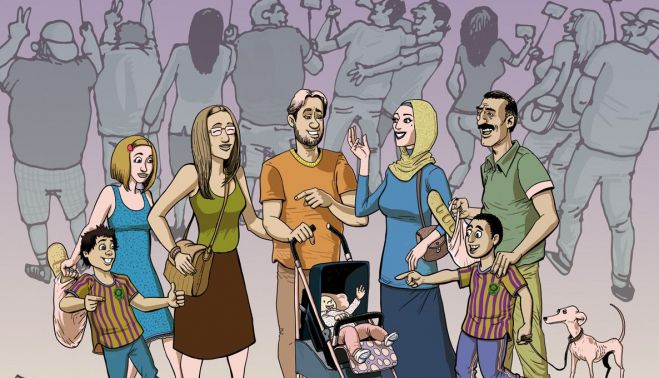 Cada ilustración contiene un hashtag asociado a la realidad del refugio en relación a tres líneas: origen, tránsito y llegada. Cada término refleja una actitud para que estos pasos consigan lograr una vida segura en convivencia. Se abordan las causas que provocan estos flujos mixtos, qué ocurre en estos viajes puesto que hay realidades tan duras como caer en redes de trata o ser víctima de vulneración de derechos humanos. Y la última parte, centrada en la llegada y en cómo crear un modelo social en el que cualquier persona que llegue se pueda sentir y ser parte de la sociedad.