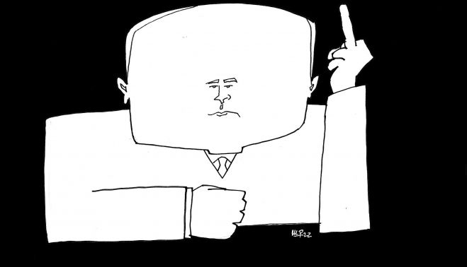 En un palacio de blancos mármoles, detrás de una gran mesa marrón, hay banderas imperiales de tres colores, rojo, blanco y azul. Un hombre sin color, sin brillo en los ojos, con un gesto hierático, a medio camino entre un zombi y un robot, justifica la invasión, acusando de nazis a los ucranianos. Sin pestañear y con un tono de voz plano, dice que los ucranianos son un peligro para Rusia, que pretendían tener armas atómicas. A continuación, amenaza al planeta con la tercera guerra mundial, si algo se interpone en su camino. Mientras, en Kiev, el monumento a los treinta mil judíos asesinados por Hitler, es bombardeado por el ejército invasor.