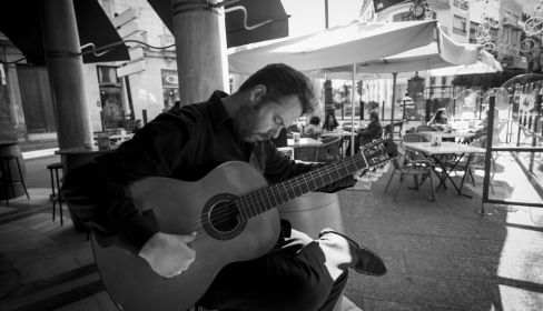 Pues no. Se quedó callado, guardó la guitarra en su funda, sonrió a todos aquellos que habíamos decidido darle unas monedas y se fue con la música a otra parte. Ella no. Ella siguió con su teoría de la conspiración. Que si ella se tiraba todo el día para ganar dos duros y que uno viene y gana lo mismo con un cantecito. Que si ella estaba enlomá de trabajar y que él, siendo de por ahí fuera, estaba mejor que ella. Que si ella es la que después le pone los cafés y no él a ella.