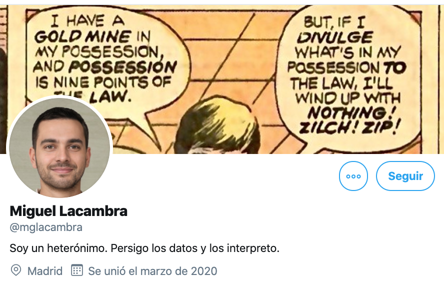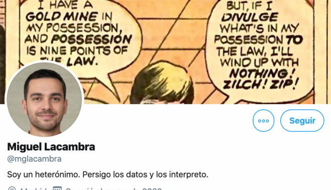Pese a la intervención de Pedro, el sábado 28 discurre monótono, solo aliviado en parte por lo que me llega de la cacería que hay en redes sociales y digitales para descubrir quién es realmente Miguel Lacambra. Hay dos posibilidades para explicar esta persecución y las dos acaban curiosamente en ‘miento’, como si fuera alguien del Gobierno hablando de la crisis que vivimos: aburrimiento o encabronamiento. Pueden elegir. Además es gratis. El tal Miguel Lacambra es alguien hasta la fecha desconocido en Twitter que de repente se ha convertido en una superestrella digital, tras difundir unos tuits y un artículo en La Marea, supuestamente apoyados en bases científicas, en los que viene a exculpar a las manifestaciones del 8-M en lo que al crecimiento exponencial de la pandemia se refiere.