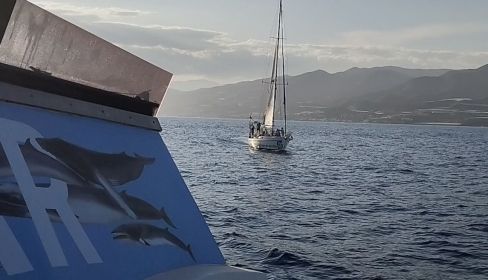 Viendo navegar ell Diosa Maat junto a La Blancazul, la escuela del mar de Alborán de Promar, que lo recibió a la entrada de Adra, los asocié a esa imagen que Aute imaginó como una metáfora de lo imposible, lo improbable, lo irreal, pero que emana tanto simbolismo y belleza. Unas embarcaciones para agarrarse a la esperanza, navegar hacia la utopía y dispuestas a ofrecer resistencia, a soñar y planificar una sociedad más justa e igualitaria, que recupere el equilibrio que nunca debimos perder.