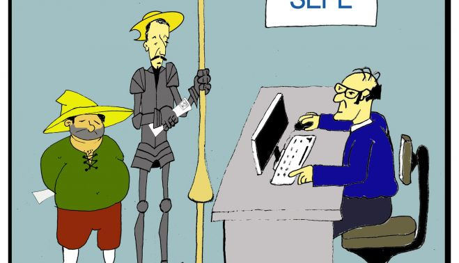 A menudo pienso en nuestros héroes de ficción más populares, que no son Mortadelo y Filemón, sino Don Quijote y Sancho Panza. Don Quijote lucha contra gigantes para defender la libertad, Sancho cree que es mejor usar otra estrategia. Hoy están fuera de lugar, porque la libertad ha cambiado de significado. Quijote y Sancho, esperan conseguir trabajo de otra cosa, a su edad y sin tener un master, lo tienen imposible. En el currículo, desfacer entuertos no sirve de nada en el SEPE, antes el INEM.