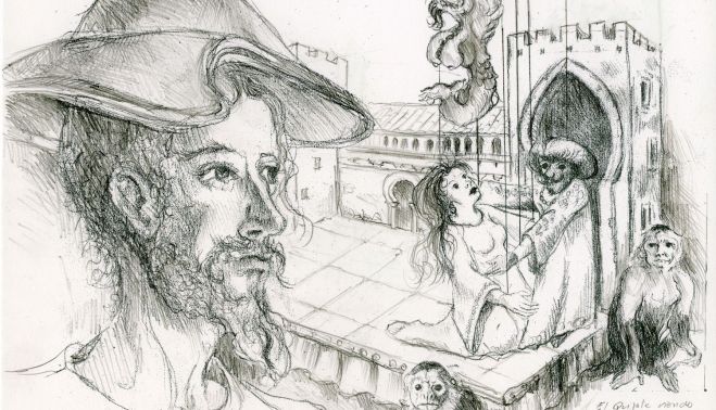 Así reza el capítulo XXVI en la segunda parte del Quijote. Dando pie a otra de las locas aventuras del caballero andante. Cómo estando en una venta asiste a una representación de títeres por parte de Maese Pedro, que además lleva un mono adivinador. Títeres que cuentan una historia procedente del romancero: Gaiferos es un héroe o caballero al más puro estilo de Sigfrido o Roldán, que irá al castillo de Sansueña a liberar a Melisendra, presa de la morería. El caso es que el bueno de Alonso Quijano, bien dado a los sueños, terminará por creerse que la historia representada es realidad, toma su espada y se lía a mamporros con los moros enemigos, tratando de socorrer a Melisendra asimismo. Todo ello para asombro de Maese Pedro y el resto de circunstantes en la venta.