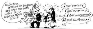 Si éstas son las armas con las que cuenta para su defensa en caso de que pudiera ser llamada a declarar ante el juez Pablo Ruz, mal lo tiene. No en vano, es la misma verdad, el mismo argumento, la misma razón, que miles de afectados por las preferentes han alegado para tratar de que la justicia se pronuncie a su favor y se les reconozca que han sido victimas de estafa por parte de las entidades bancarias sin apenas resultados. O incluso prácticamente lo mismo que alegó la infanta imputada ante el juez Castro para exculparse de los marrones de su esposo: no sabía lo que firmaba, no le constaban irregularidades... Fue el humorista gráfico Pedro Carabante 'Peri' quien mejor ha resumido, ayer en las páginas de Diario de Jerez, la secuencia y la comparecencia extraordinaria de la alcaldesa: