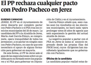 Junio de 2003. Javier Arenas, el campeón de campeones. Sí, el mismo de más arriba. Moreno clásico ya preveraniego. Elecciones municipales recién finalizadas. Se habla de un pacto con el PSOE. ¿Pelayo y Pilar Sánchez juntas para negociar? Sí, ellas pudieron. Si las paredes del Hotel Jerez hablasen... ¿Qué pasa in extremis? Se rompe. Arenas renegocia con el hasta entonces alcalde de la democracia, Pedro Pacheco, y entonces candidato del PSA. ¿Cómo? Pero si en los meses previos el PP dijo textualmente (titula ABC): "El PP rechaza cualquier pacto con Pacheco en Jerez". Y sigue: "García-Pelayo añade que, sean cuales sean los resultados en las elecciones municipales, no hará nada para prolongar estos 25 años de agonía que está suponiendo la gestión del actual alcalde de Jerez. En esos "años de agonía", como dice, Jerez tenía unos 10.000 desempleados. Hoy hay más de 33.000, unos 4.000 más desde que ella es regidora con mayoría absoluta desde junio de 2011.