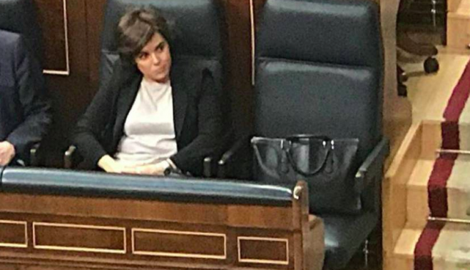 Ese bolso descansando en el sillón vacío de Mariano Rajoy. Por otro lado, impensable en otro Parlamento, donde el respeto a las instituciones es una obligación. No voy a extenderme sobre este asunto porque mi parecer sobre la ausencia en su moción de censura es de reproche.