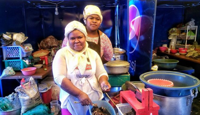 Cierta mañana, a la hora del almuerzo, que unas veces voy a casa y otras me pierdo literalmente por las cercanías, en la explanada junto al Ministerio de Medio Ambiente había una feria de comida esmeraldeña, cuyos olores, música y agradable griterío llegaron hasta mis oídos y, con una compañera de trabajo, probamos fortuna en medio de aquella batalla a favor del apetito. Cómo no. Vamos allá. A ver qué nos ofrecen ante nuestro paladar y narices. Y producto de todo aquello, de entre todas las sensaciones de placer, buen trato y cariño, me quedé con el semblante de dos orondas y bondadosas cocineras, destacando su “belleza” de entre las ruinas en que se ha convertido el propio concepto entrecomillado. Después de haber almorzado sancocho de camarón y corvina frita con menestra, conversado con la mesera acerca de aquellos y otros platos, e incluso habiéndole mostrado una fotografía de mi madre dirimiendo con la parrilla sobre la boca de una chimenea, en una bodega de Torquemada.
