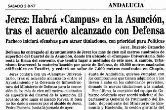 Junto a otras organizaciones políticas, sindicales y culturales, varias veces en Jerez hemos denunciado los pacifistas [ver más abajo algunos ejemplos] las realidades de la militarización en nuestra ciudad. En su momento, a mediados de los años 90, formamos parte de la plataforma ciudadana en favor de la construcción del campus universitario, la cual estaba centrada en presionar al Ministerio de Defensa para que cediera los terrenos del cuartel de La Asunción (también llamado el 74) para que dicho campus se edificara. Y Defensa cedió, obligando al entonces alcalde de la ciudad a darle a cambio una parcela de 7.000 metros y a darle también licencia urbanística para que se pudiera obrar sin cortapisas en los terrenos de otro gran cuartel que poseía en la calle Taxdirt.