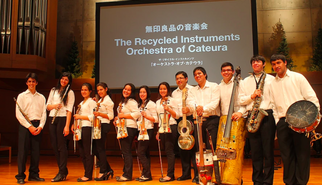Esta orquesta es una agrupación musical conformada por jóvenes y niños que viven en la comunidad que se asienta en torno al vertedero de Cateura, el más grande de Asunción, la capital de Paraguay. Un lugar sin demasiadas oportunidades; una comunidad cuyos habitantes se ganan la vida, en su mayoría, rebuscando entre la basura algo de valor. Y lo que hace tan especial a esta formación musical es que todos sus instrumentos están fabricados a partir basuras recicladas bajo la dirección del lutier y técnico ambiental, Favio Chávez. Bueno, tal vez no es eso lo que la hace tan especial, sino el hecho de que, a través de ella, niños y jóvenes en riesgo de exclusión social se integran en un proyecto que los empodera, mejora su autoestima y les brinda oportunidades personales y profesionales que les permiten creer en el futuro.