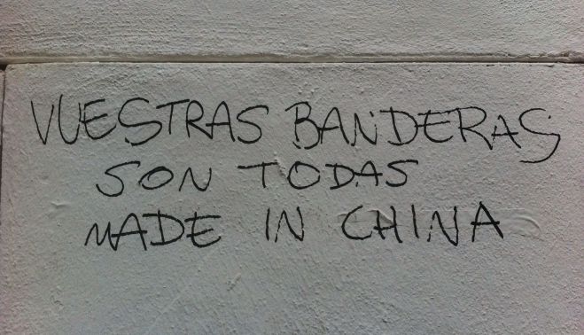 Daba gusto pasear por el centro de Barcelona la tarde del jueves 12 de octubre, día de la Fiesta Nacional de España, entre centenares de ciudadanos envueltos en senyeras constitucionales o en banderas rojigualdas, exhibiendo sin miedo su orgullo de sentirse catalanes y al mismo tiempo españoles. Mas al fin uno se harta de tanto trapo, se olvida de ellos, y se dedica solo a disfrutar de la preciosa capital catalana ahora que el turismo ha sufrido un receso y los hoteles y restaurantes rebajan sus precios para atraer clientela. Porque al fin y al cabo, como reza una pintada aparecida en las calles de Cádiz, “vuestras banderas son todas made in China”.