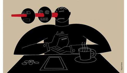 En la imagen vemos que, sobre una nariz larga de mentiroso compulsivo, el especulador tiene distintos rostros preconstruidos, cada uno especializado en la consecución de un determinado fin. Es una figura solitaria conectada a través su smartphone de última generación con otras figuras solitarias con las que comparte hábitos semejantes, tales como beber café para mantenerse permanentemente vigilantes desde su atalaya.