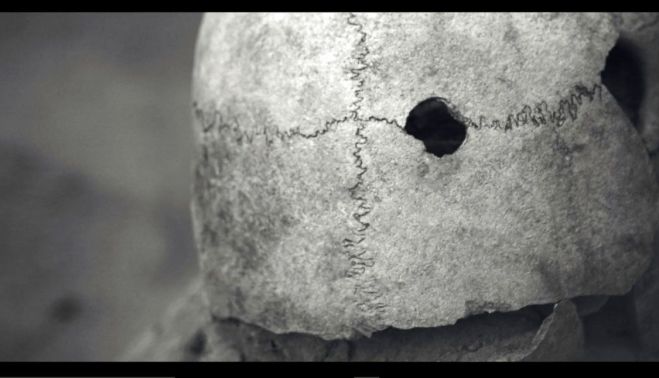 …imagino el alarido de angustia escapando por ese orificio de bala después de ochenta y un años atrapado. El alivio de una claustrofobia de tumba terrosa que oprime el alma. Soy capaz de sentir el aire fresco que le inunda después de lustros de putrefacción. Me hace feliz imaginar la explosión de libertad y la gratitud a raudales que fluye del orificio. Imagino el cuerpo hablando y riendo a borbotones a través de él. Y comprendo muy bien cómo el hueso muerto agradece las caricias que le ofrece Asun, aunque sean roces con una brocha. Podría ser el abuelo de su madre, por eso hay una lágrima viva que se le escapa a la joven y humedece el cráneo seco de tanto esperar.