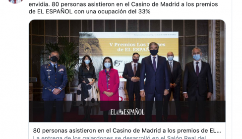 El Gobierno ve con buenos ojos que las autonomías reduzcan las reuniones a seis personas. Reservamos el Casino de Madrid para “ochenta”. Recomendamos no salir de casa más que para lo necesario. El Español decide celebrar la V entrega de sus Premios León. Apelamos a la responsabilidad individual. El ministro de Sanidad es el invitado estrella. Aconsejamos no abrir el círculo de contactos más allá de los frecuentes y convivientes (grupos burbuja). Almeida comparte mesa con el Jefe de Estado Mayor de Defensa, Miguel Ángel Villarroya. Las mascarillas solo podrán retirarse en el momento de la ingesta. Llenamos el Salón Real del Casino de figuras públicas que, atentas al discurso de P.J. Ramírez, se han olvidado de usarlas. Arrimadas entre ellas. ¿Los grandes ausentes? Los miembros del grupo parlamentario socialista -—incluyendo al presidente Pedro Sánchez—, Unidas Podemos y Vox.