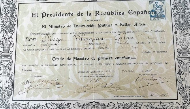Según me cuenta Angelita, la hija de don Diego, apenas han quedado en su casa documentos o recuerdos de su padre a excepción de algunas fotos y su título de maestro firmado por el presidente de la Segunda República y alguno más. El motivo es que D. Diego prefirió que esos recuerdos suyos estuvieran en manos de sus nietos y de esta manera se los fue repartiendo a medida que estos se iban haciendo mayores. Así, a uno le daba algunos de sus dibujos, a otro su carnet de estudiante de Química de la Universidad Central de Madrid o a otros, por ejemplo, ciertos documentos con sus notas obtenidas en las diversas etapas de estudio por las que pasó.