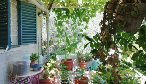Las macetas se ven repletas de peperomias, clivias,geranios, margaritas y, regaladas por el jardín, palmeras, hibiscos, camelias y hasta un arce japonés. Y presidiendo la entrada a la casa ofreciendo su sombra al caminante, el enorme alcornoque. Majestuoso y adorable tronco que del árbol sale. Las encinas, las higueras aquí y allá pero ordenadas en sus tierras ocres y marrones.