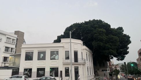Del edificio se pueden decir varias cosas. Que es de un estilo ecléctico fechado en 1932, que se destinó en un principio a instituto higiénico y luego a sede de la Policía Local y, ah, que en su subsuelo reposan restos arqueológicos de época emiral. Pero estas cosas no interesan a nadie y en el presente, vivo y apremiante, atrae la atención más que nada ese fantástico ficus benjamín que abraza al edificio y que parece que se lo va a acabar tragando.