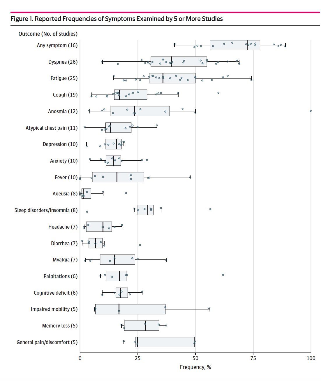Personas como @Medtorek nos cuentan que no todo acaba cuando el paciente ha tenido covid-19. Y por otra parte leemos por @longcovidcyl que Salma Hayek se suma a la lista de los afectadaos por long covid. En una revisión sistemática de > 9.700 individuos de 45 estudios de COVID persistente nos plantea la revista JAMA que los síntomas de estas personas es la siguiente: