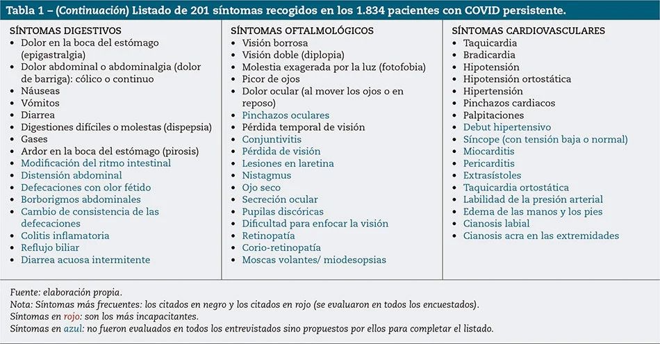 Entre esos más de 200 síntomas relacionados con esta nueva patología, ha mencionado como los de mayor incidencia el cansancio generalizado, que afecta al 95 por ciento de los pacientes; el malestar general, también presente en el 95 por ciento de los casos; los dolores de cabeza (86%); alteraciones en estado de ánimo (86%); dolores musculares (82%); la falta de aire o disnea (78%); dolores articulares (79%); y falta de concentración o niebla mental en el 78 por ciento de los casos.