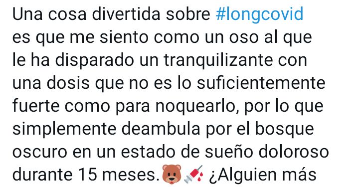 Y ante ello leemos que @AndaluciaCovid dice: "Muchos compañeros enfermos con covid persistente están teniendo problemas con las bajas laborales". Y @longcovidaragon explica: "A los pacientes de covid persistente les gustaría encontrar fórmulas flexibles para poder incorporarse a su puesto de trabajo a la medida de sus fuerzas". Y añaden unos y otros: "Reivindicamos una baja ajustada a la enfermedad y una incorporación paulatina a la actividad laboral".