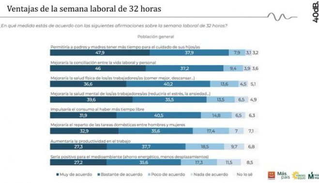 Por contra, la gente también cree que podría tener desventajas. Que aumente las horas extra (57%), que perjudique a pequeñas y medianas empresas (49,7%) o que genere sobrecargas de trabajo (45%). (Por cierto, la gente ve en general más claras las ventajas que las desventajas). ¿Y para qué quiere la gente tiempo? Pues para pasar más tiempo con los suyos, para descansar, para dedicarse a sus aficiones y hacer ejercicio. Esto indica que reducir la jornada de trabajo está asociado a actitudes sostenibles: que generan bienestar sin apenas huella de carbono.
