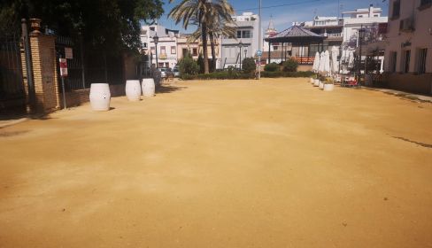 Un riego matinal por los jardineros municipales y pasada la tarde por parte de los quiosqueros sobre el albero, se agradece junto al frescor complementario de plantas, árboles y arbustos, así como del río, y otorga un colorido anaranjado, genuino del color albero mojado.