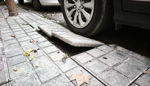 Construir adecuadamente y conservar, frente a destruir y abandonar. Acerado peatonal perfectamente ejecutado no puede soportar cargas de camiones de más de 12 toneladas, si no queremos ver baldosas rotas, desniveladas, charcos con lluvia y en grave riesgo nuestra propia integridad. Por cierto, las cisternas para el ocasional baldeo y vehículos de limpieza mecánica también afectan.