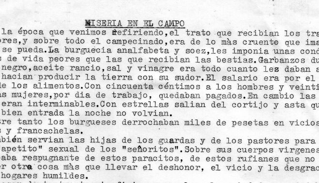 “Garbanzos duros, pan negro, aceite rancio, sal y vinagre era todo cuanto les daban a los que hacían producir la tierra con sudor. El salario era por el estilo de los alimentos. Con cincuenta céntimos a los hombres y veinticinco a las mujeres, por día de trabajo, quedaban pagados. Con estrellas salían del cortijo, y hasta que no era bien entrada la noche no volvían. Por la noche, en las gañanías, a la luz de un candil humeante, los que sabían leer lo hacían en voz alta para ilustrar a los compañeros de infortunio. Los demás trabajadores, sentados en los jergones, escuchaban atentamente la lectura, ávidos de aprender. Durante el día, en los momentos de respiro hacían corro y comentaban las noticias que recibían sobre la marcha de la organización. Otros llevaban la cartilla, lápiz y libreta en el bolsillo, y aprovechaban todos los minutos de descanso para aprender a leer y a escribir orientados por algún compañero voluntarioso”.