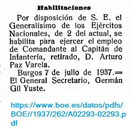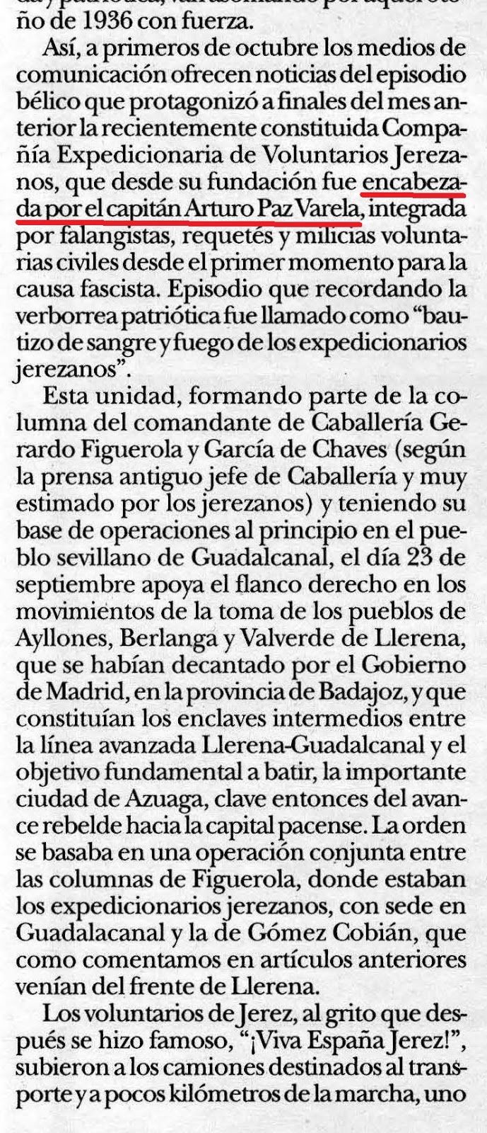 El comandante Paz Varela, que luego parece ser que llegó al grado de coronel, fue una persona implicada en el golpe de estado y en los movimientos militares de Franco y Queipo de Llano por Andalucía desde el minuto uno. Participa en varias operaciones militares de envergadura, comandando su Compañía Expedicionaria de Voluntarios Jerezanos.