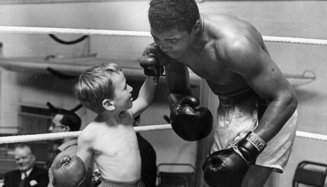 Lejos de esa imagen frívola, díscola, esperpéntica, bocazas y burlón que daba sobre el ring, fuera de él Ali supo ser consciente que los ojos de muchos jóvenes se posaban en sus poderosos brazos y asumió un deber para el que nadie lo invitó.