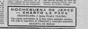 Esta publicidad en un periódico de Barcelona en 1951, no nos dice quiénes son los intérpretes pero deja a las claras que la Nochebuena de Jerez es un buen producto de consumo. Hoja oficial de la provincia de Barcelona Año XXVI Número 669 - 1951 Diciembre 24