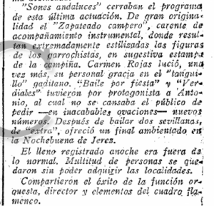 Pero los ecos de las famosas estampas perduraron en el tiempo. Antonio Ruiz en el año 1963 en el Festival Sevillano, tuvo un rotundo éxito durante tres días “al cual no se cansaba el público de pedir -en inacabables ovaciones– nuevos números. Después de bailar dos sevillanas, de extra, ofreció un final ambientado en la Nochebuena de Jerez.