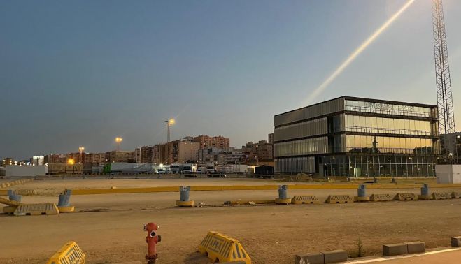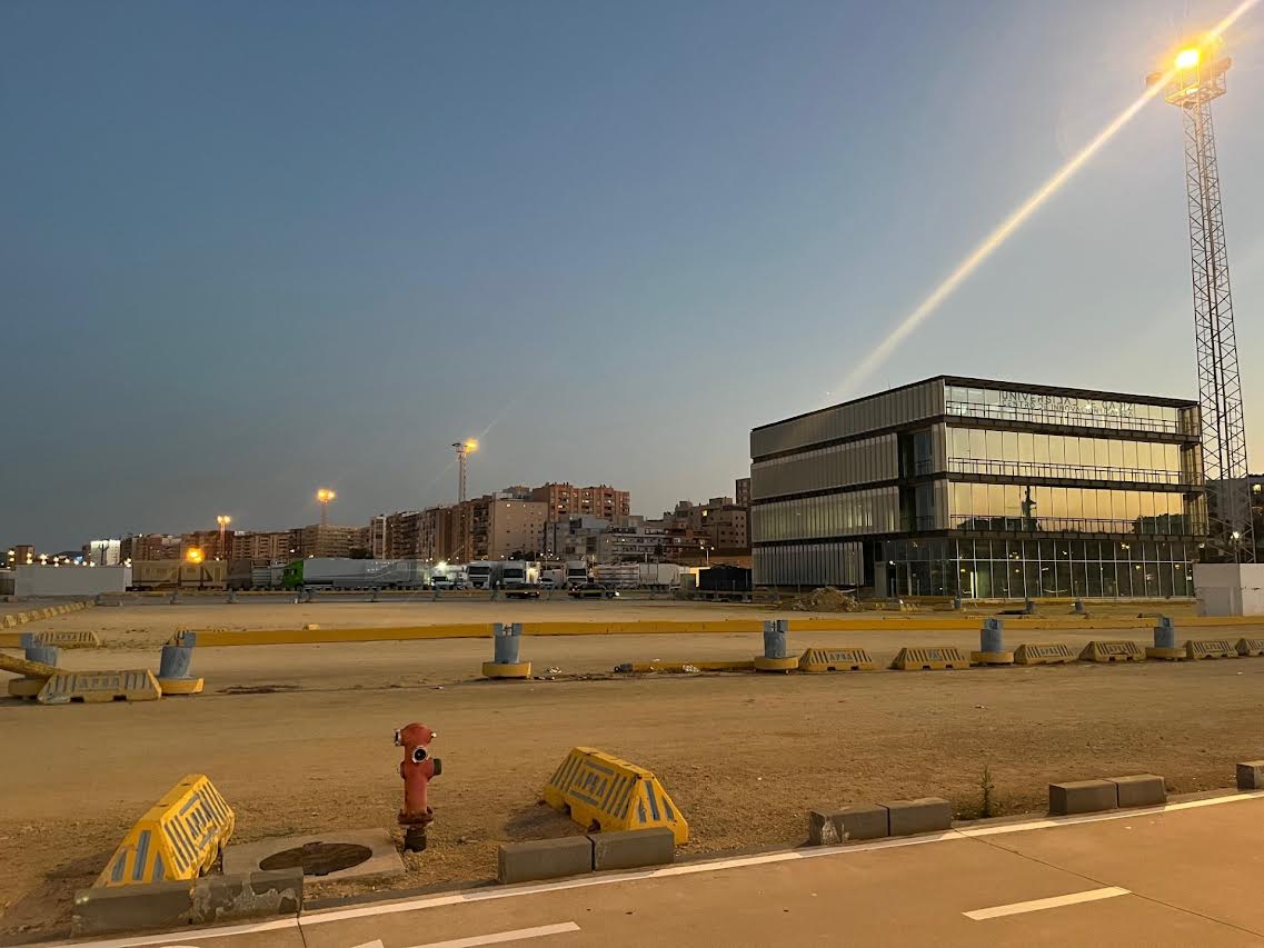 La panorámica es amplia y detallada. A Levante, los miles de contenedores apilados. A Poniente, el muro de edificios de doce plantas tapa la ciudad. En la entrada un cartel anuncia el Lago Marítimo. Está bien, incluso el nombre. Peor hubiera sido “La Bahía especial” o “El Rinconcillo de la libertad”. Y además entre Llano Amarillo y Lago Marítimo sólo cambia un par de letras. Sugiero una cosa. Una cosa bien humilde y delicada desde una columna insignificante y gratuita como esta. Que los versos de la Bahía de José Luis Cano queden grabados en algunos puntos discretos de lo quiera que acabe siendo este paseo. Porque, al día de hoy, lo que hay, es esto. Una explanada polivalente y un edificio acristalado recién construido. Mira, —me señala el amigo—. Ahí tienes la respuesta a tu artículo del otro día.