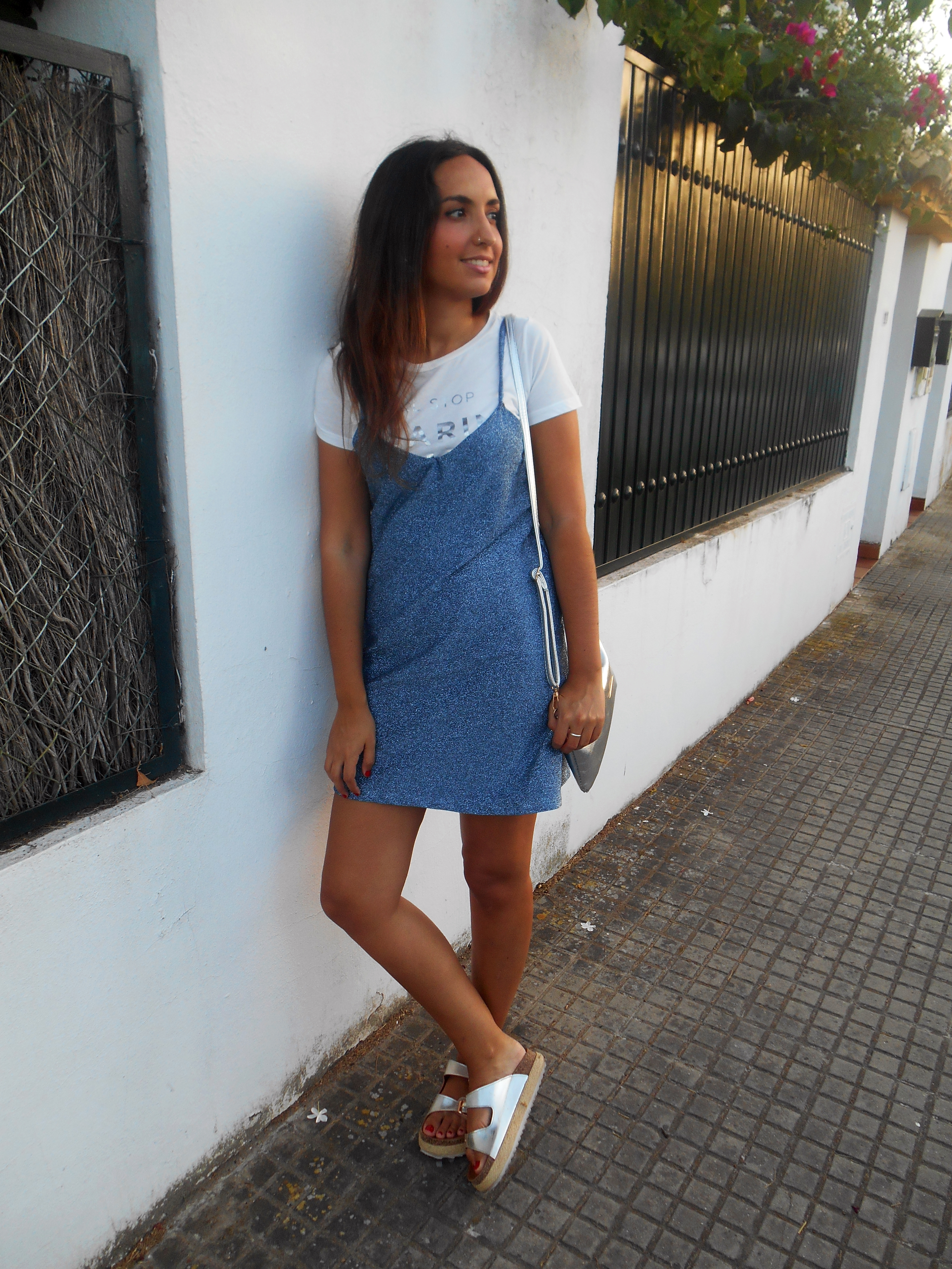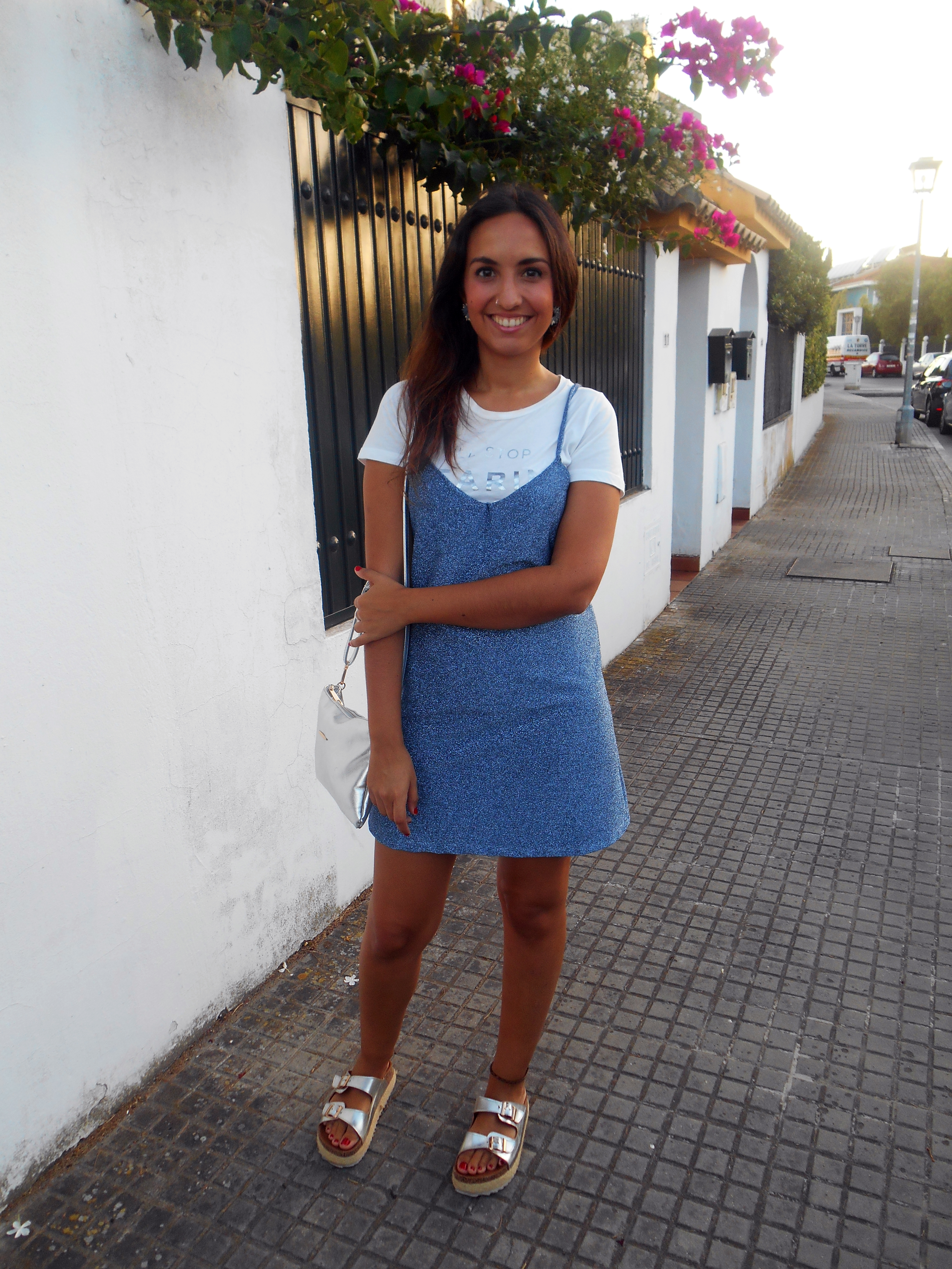 Hoy os enseño un look muy brillante y nada desapercibido, compuesto por este vestido de purpurina celeste que, al verlo colgado en la tienda, llamó toda mi atención.