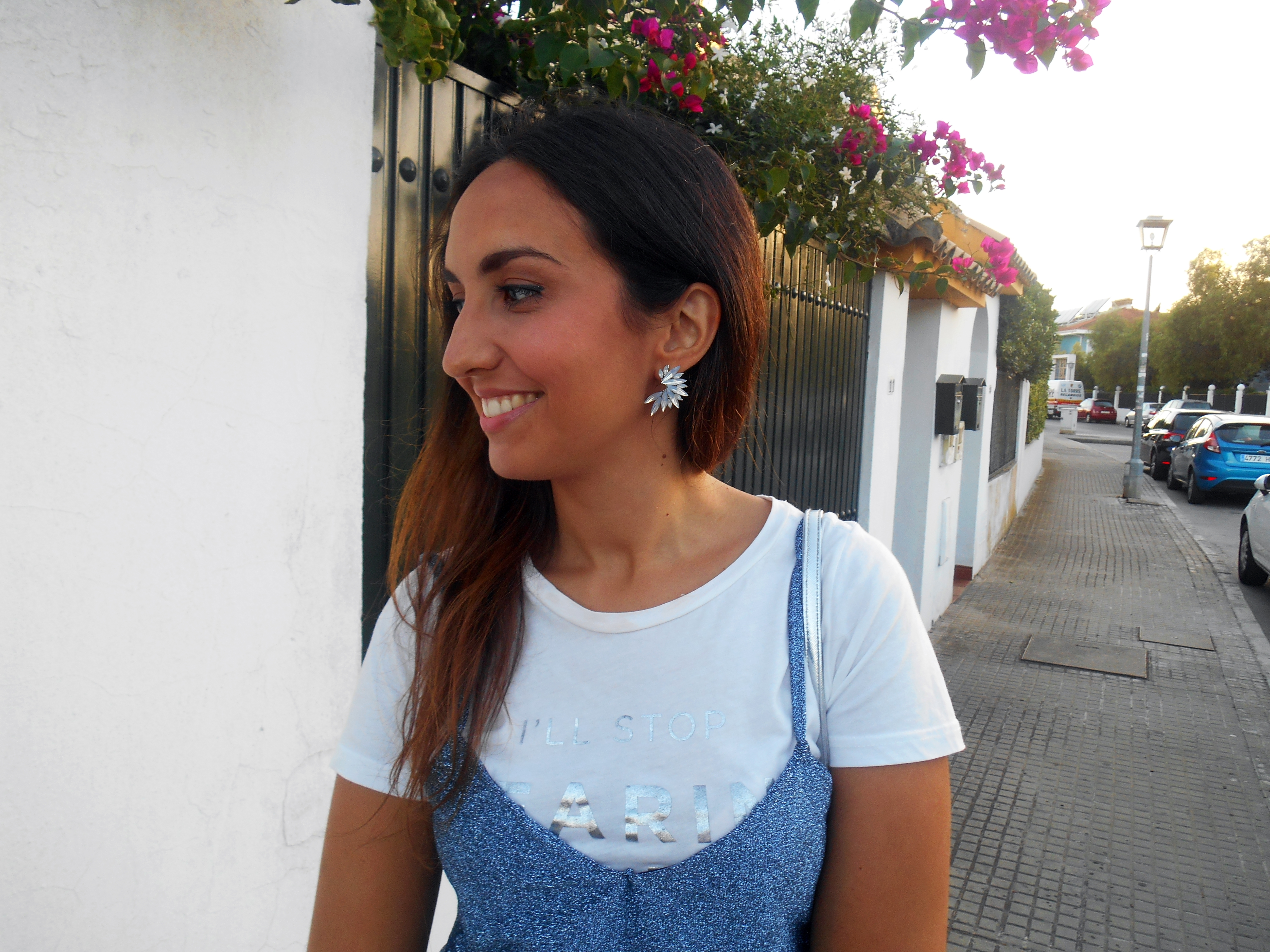 Como la superposición de camisetas con vestidos de tirantes esta muy de moda aproveché la ocasión para lucirlo así. Además, también estrené estos pendientes joya que le venían ideales al conjunto.