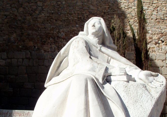 Baste recordar esa estatua que se erige junto a la muralla de Ávila: Teresa mira al cielo absorta, en pleno éxtasis, con la palma de su mano izquierda bocarriba, mientras con la derecha empuña el arma “de destrucción masiva” por antonomasia: una pluma cuya punta esboza los renglones de alguna de sus obras sobre un papel.