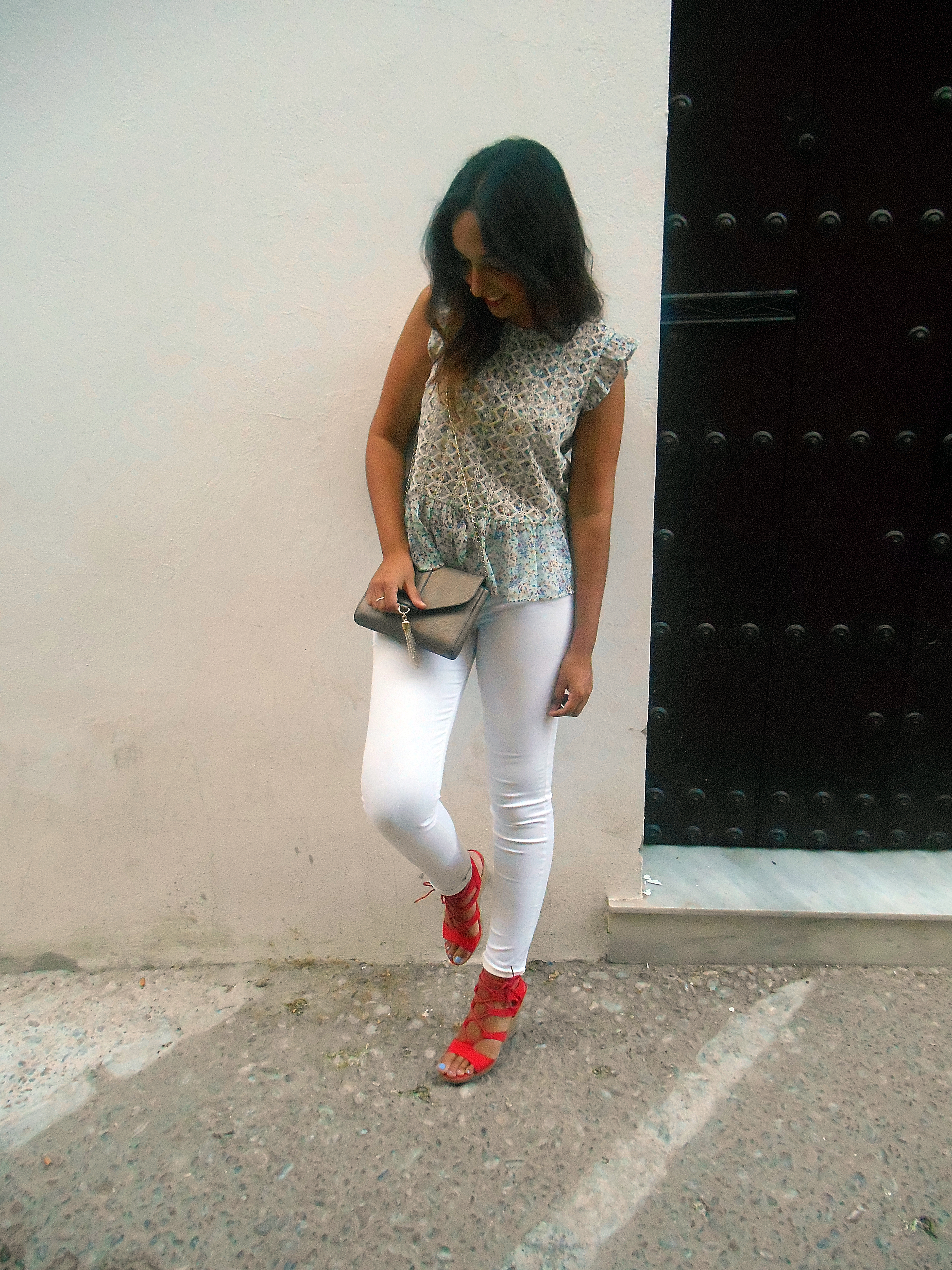 La combiné con unos pantalones pitillos de color blanco y unas cuñas rojas. ¿Qué os parece?