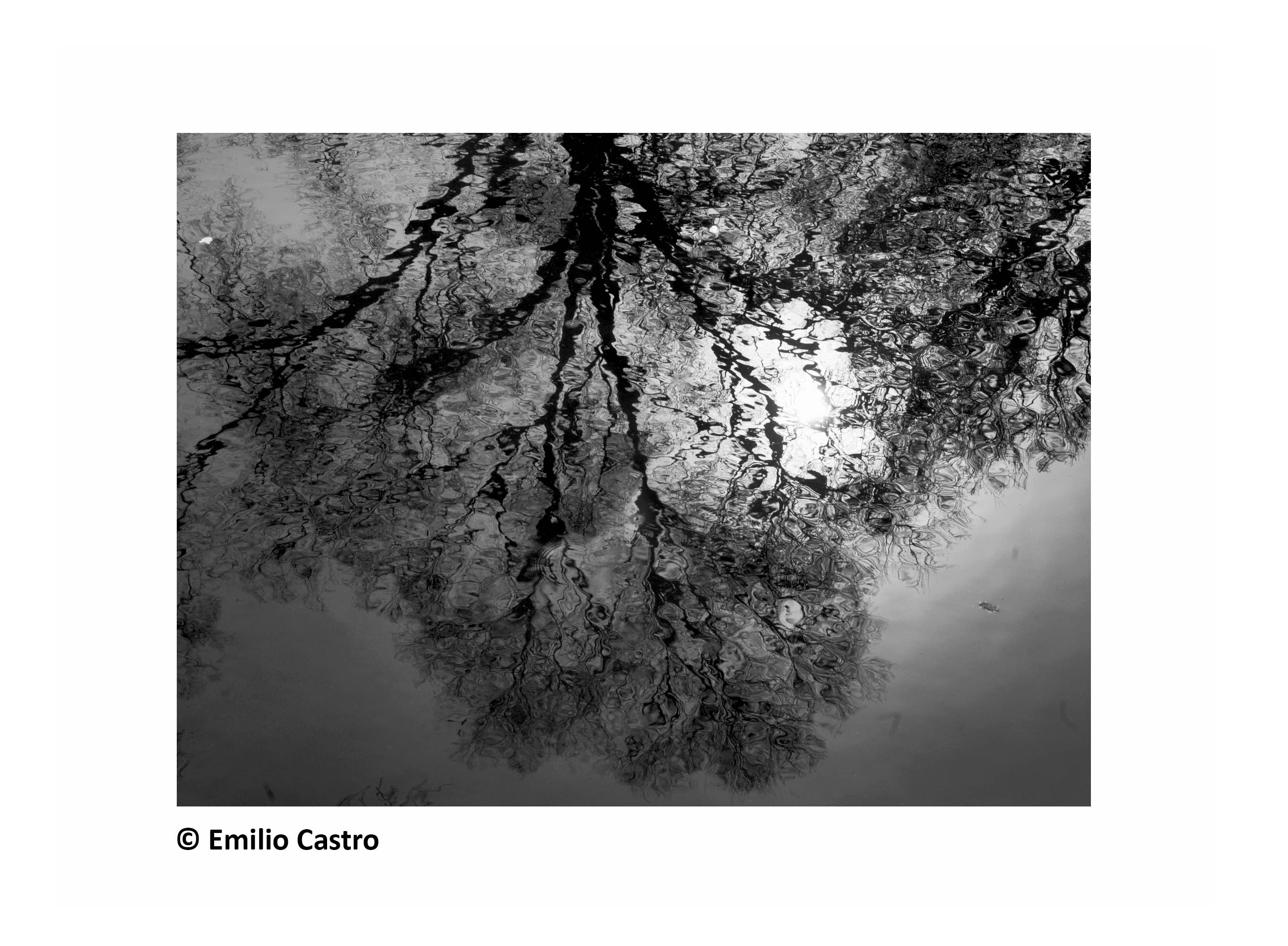 Pese a todo, prefiero el autoengaño y fotografiar el trampantojo de un árbol regado por goteo, no porque quiera vender nada, el pescado ya lo venden otros; sino porque la realidad es mucho más cruel que la fantasía y hoy prefiero evadirme. Me gusta compartir la ilusión de un golpe de vista, de una mirada. A veces las palabras no llegan donde las imágenes. Esta imagen se descompone, se cuartea volviéndose blanda; basta una pequeña perturbación, la onda generada por una piedra, para que todo desaparezca. Basta un ansia de poder, un complejo de inferioridad mezclado con nacionalismo y mucha mala leche, para que nuestro parque mundial, sea devorado por sus reflejos distorsionados. Una sola piedra y todo se hunde perturbado.