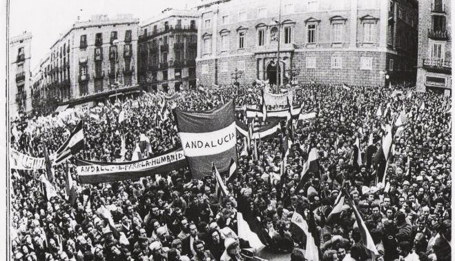 En 1977, la gran mayoría de los partidos políticos de Andalucía habían decidido convocar una manifestación en demanda de Autonomía. Se fijó la fecha del domingo 4 de diciembre para realizarla. Los andalucistas en Cataluña, militantes de la Agrupación de Socialistas Andaluces en Cataluña (ASAC), vinculada al PSA, decidieron impulsar también en Barcelona una gran manifestación en pro de la Autonomía de Andalucía. Estos andalucistas, muchos de ellos integrantes de Asociaciones culturales andaluzas y peñas flamencas, llevaban todo el año haciendo actuaciones a favor de la autonomía andaluza y de dar a conocer entre la amplia colonia andaluza en Cataluña, los símbolos de Andalucía que aprobaron los andalucistas históricos, especialmente la bandera verde blanca y verde. Una de estas acciones fue pasear por el césped del campo del club de fútbol del Español, en Sarrià, una gran bandera andaluza con el lema “Autonomía”, Bandera que poco antes habían descolgado otros andalucistas desde la Giralda de Sevilla.