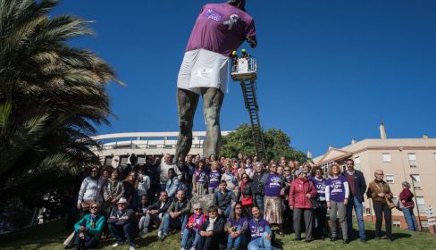 Es impresionante ver al Minotauro con la camiseta morada que le han colocado en reivindicación contra la violencia de género. La verdad es que —ajeno a casi todo lo que me rodea, tal y como vivo— desconocía por completo esta iniciativa y a los primeros que hoy hablar de la camiseta y del acto de colocación que tuvo lugar el martes por la mañana fue a dos conductores de autobús, que hablaban en la cabecera de la plaza Esteve del atasco que se había montado en la rotonda un rato antes. En realidad hablaban en tono tirando jocoso de quién se lo había comido, el atasco, de entre sus compañeros.