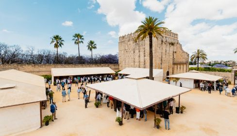 Pero si es que tú misma no fuiste hasta el segundo día, el lunes: Vinoble abriendo sus puertas el domingo, todo el mundo llegando, aunque los más lejanos, canarios aparte, vinieran de puntos tan orientales como Alicante o Jumilla –momento que voy y aprovecho para recordar por ejemplo a Toni Komacek, un esloveno que vino varias ediciones a dar a conocer sus vinos… y a hablar por señas con todo el mundo con el que se cruzaba; y también a un señor de Georgia tan simpático que mi amigo Fernando Taboada y yo estábamos seguros de que sopesaba seriamente casarnos con alguna de sus hijas: el buen hombre se trajo a Jerez una buena provisión de vinos y de hijas… lo que da la tierra— y mientras tú por ahí, Mamen, de acto preelectoral en una barriada, inmortalizada gráficamente en el noble juego de tirar de una cuerda, ejercicio, por otra parte, muy sano también, y muy de toda la vida, todo hay que decirlo. Y un par de días después, pullita al canto al decir en una visita a un centro escolar que tu gobierno municipal es más de invertir en colegios que en palacios… que a ver, que sí, que a favor, que desde luego, pero si se tiene en el patrimonio municipal el palacio de Villavicencio y el Alcázar, lo que cualquier cursi al uso vendría a calificar como un ‘marco incomparable’, pues tendrá que estar perfectamente y, además, mejor que sirva para Vinoble que para fotografiar a recién casados, vamos, digo yo (sin ánimo de molestar, eh).
