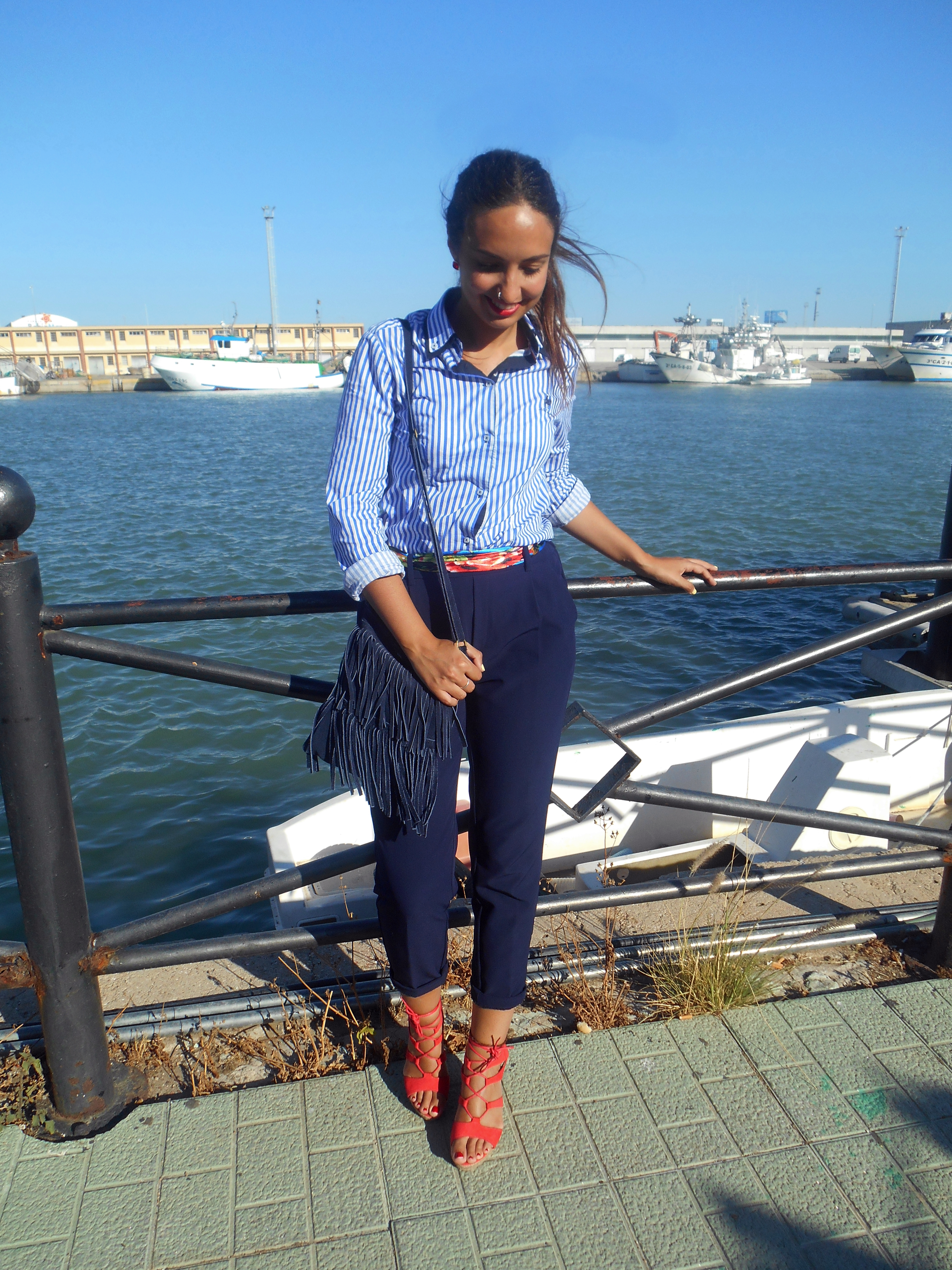 Esta vez lo combiné con un mix de estampados y tendencias como ya veréis: Lo primero de todo con una camisa de rayas, blancas y azules. Luego, con un bolso de flecos también en azul. En los pies, unas cuñas rojas de estilo lace up que últimamente veis mucho por aquí, pero es que se anda genial con ellas. Y para acabar el look, jugando con los tonos azules y rojos del conjunto, usé el pañuelo de flores que otras veces habéis podido verme a modo de turbante pero esta vez lo he usado como cinturón.