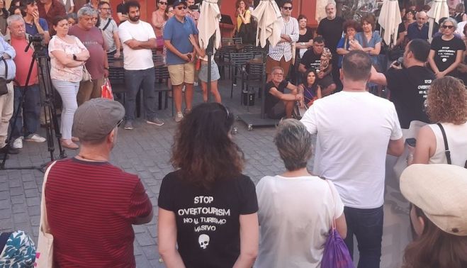 En la ciudad hispalense algo de brisa fresca entró este pasado miércoles día 26 en forma de denuncia social y concentración de camisetas negras bajo el lema “Stop Overtourism. No al turismo masivo”. El acto celebrado en la Plaza del Salvador es una más de las acciones que el colectivo “Sevilla se muere” viene desarrollando en sintonía con un despertar general de una ciudadanía, que pone el punto de mira en la implantación de un modelo turístico depredador con los espacios urbanos y patrimoniales de urbes, que están siendo convertidas en escenarios huecos e incompatibles con una convivencia y desarrollo armónico con los derechos de los propios residentes.