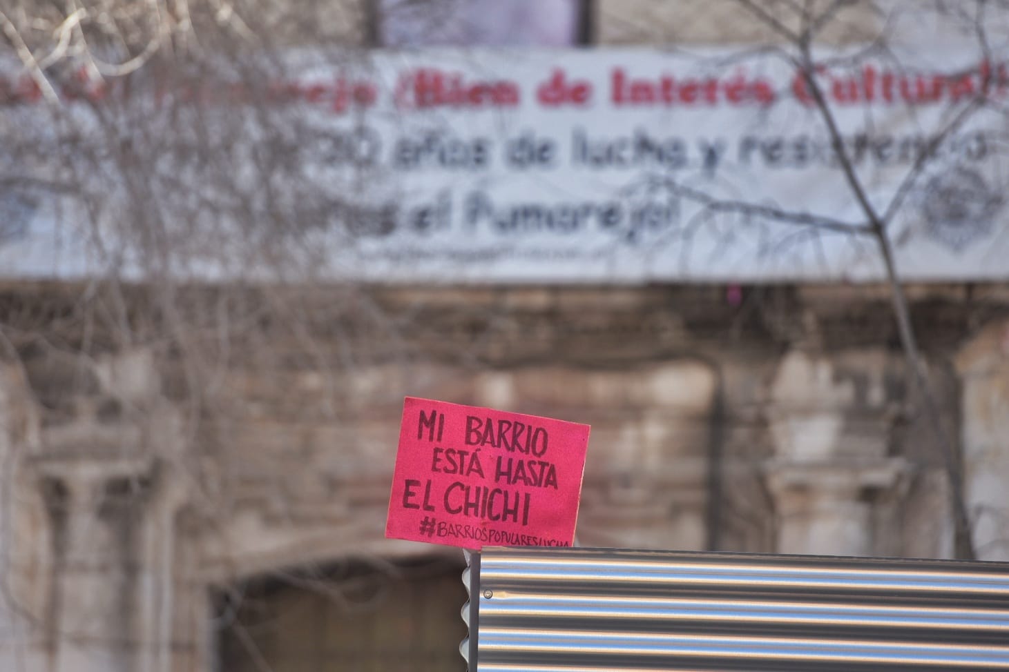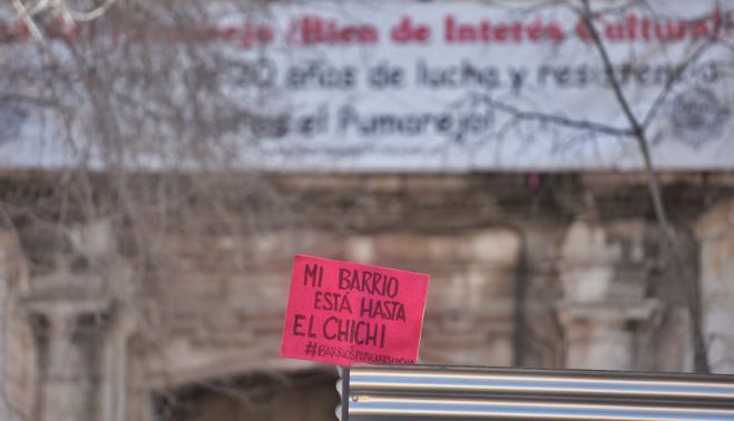 En las recientemente iniciadas obras del Pumarejo, para rescatar al fin esta joya en un barrio que resiste mejor que otros a los cambios, un cartel preside la plaza. No es grande, no es enorme, no es la pancarta de la casa palacio. Pero manda un mensaje claro: "Mi barrio está hasta el chichi".