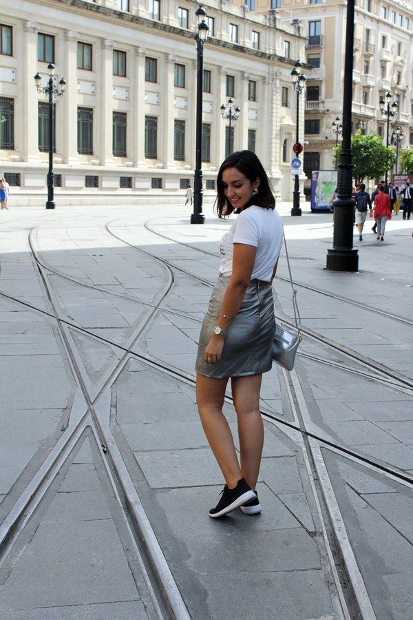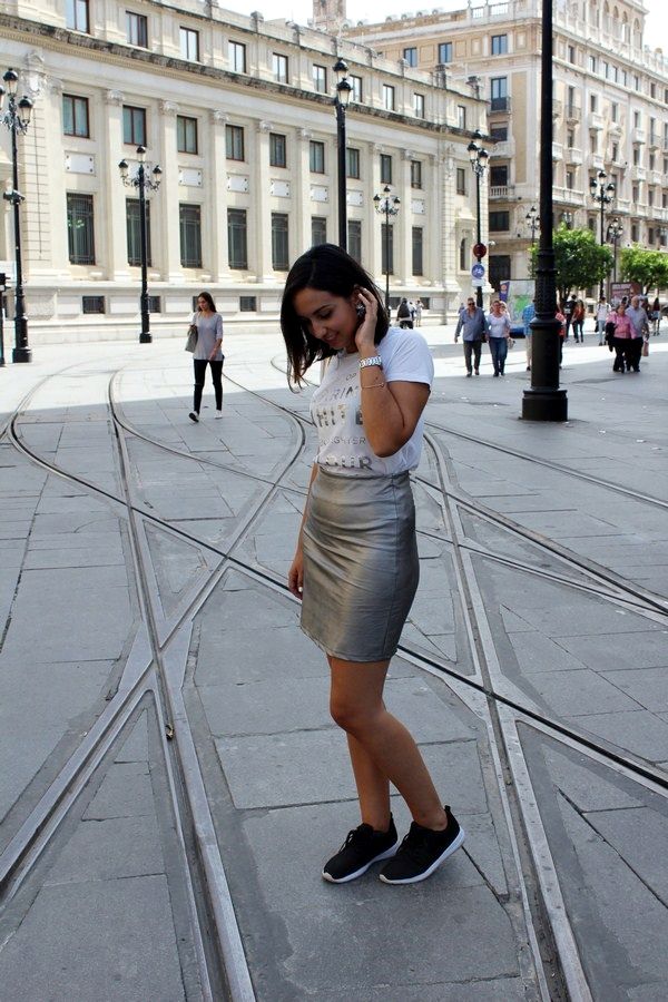 A pesar de la fecha en la que estamos, hacía una calor horrible así que no pude poderme tooodo lo que tenía pensado para completar el outfit, como era un gorro y una cazadora de cuero negra. Aún así, creo que quedó un conjunto muy chulo y moderno compuesto por mi nueva falda plateada de polipiel que ¡me encanta! Sin duda es la estrella del look.