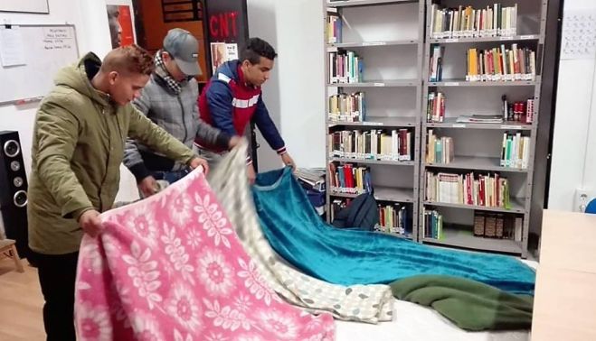 Una noche más, tres chavales son arrojados a la intemperie por insensibilidad e incomprensión de gente que no se preocupa por ellos, y que seguramente no duermen al raso. Salah, Mohamed y Yusef dormirán, como otras veces ha sido preciso, entre los libros de nuestra biblioteca de CNT, porque para nosotras no hay patrias ni fronteras y ninguna persona es ilegal. Sebastián Oliva, Kropotkin y Emma Goldman acunarán sus sueños de dignidad.