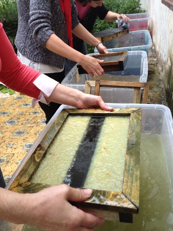 Dándole vueltas a la sesera se me ocurrió (y esta Semana Santa lo pongo en pie en Puerto Real), organizar un taller de Fabricación de Papel/Libro de Artista. Llamo a Juan Barbé, un guipuzcoano loco por la investigación de con qué fibras naturales poder conseguir papeles que den tales o cuales calidades y texturas. Es, sin duda, el mejor hacedor de papeles artesanales de Europa y su trayectoria internacional le abala.