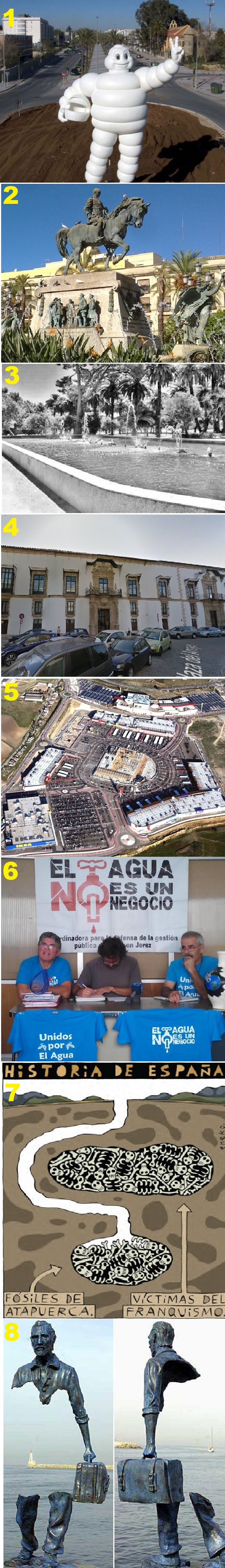 ¿Para cuándo el derribo del humillante Bibendum? Sólo faltan 14 meses y 29 días para que Jerez cumpla la pena de 10 años de oprobioso castigo por la nefasta gestión pachequista que condujo a este impuesto revolucionario visual. ¿Cuándo lo echaremos abajo? ¿Y quién pagará los gastos de derribo y desescombro de la horrorosa estructura de 2.381 kilos y 9,25 metros? ¿Y también, para cuándo una explicación sobre el paradero de los 50 millones de pesetas que Michelín puso para el Speed Festival?