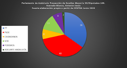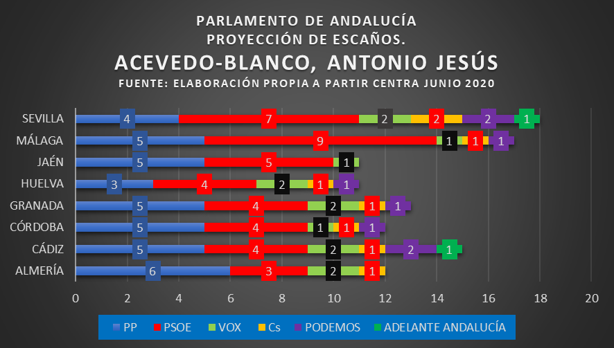 Por último, presentamos la proyección al Parlamento de Andalucía sin entrar a comentar los resultados estimados, pues esta tarea ya sería objeto de otro análisis posterior. Resaltar en orden a orientar al lector que el Parlamento de Andalucía está compuesto por 109 escaños con una mayoría absoluta situada en los 55 escaños. Como podemos apreciar dentro de los bloques partidistas de la izquierda (PSOE+Unidas Podemos+Adelante Andalucía) una posible alianza sumaría 50 escaños, insuficientes para alcanzar una mayoría absoluta. Por la derecha (PP + Ciudadanos + Vox) se podría volver a revalidar la actual alianza de gobierno pues estas los votos en el Parlamento de formaciones sumarían 59 escaños.
