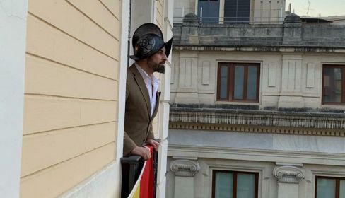 Quizá el partido que más juega ahora mismo con relatos y con teatralidad es Vox. Son buena prueba de ello el absoluto maximalismo en sus declaraciones contra el Gobierno, la dinámica de buenos y malos y la epicidad propia de las teorías de Joseph Campbell acerca del viaje del héroe o el monomito, o hasta un vestuario específico, como las mascarillas color verde guardiacivil con su bandera de España o incluso el casco del siglo XVI —denominado morrión— con el que Abascal se asomó a un balcón a hacer a saber qué.
