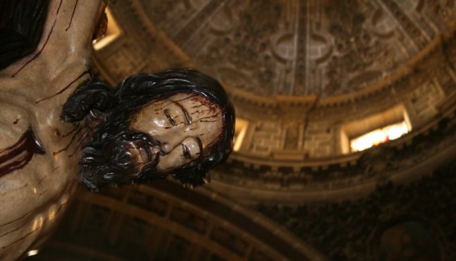 Tomar la calle San Miguel desde la plaza del Arenal después de tomarme un café y entrar en la parroquia me da muchas satisfacciones estéticas. Me transporto al barroco del siglo XVII y cuando me presento ante el cristo, en el sagrario, me quedo impresionado. No quiero menospreciar a ninguna otra imagen de nuestra ciudad. Pero en este caso me deleito, porque no tiene comparación alguna. Es un crucificado que visto en según que postura o ángulo cambia completamente. No hay una muerte más dulce en Jerez y se descuelga derramándose en una anatomía pluscuamperfecta. Su barbilla, lo menudo de su cuerpo desde cerca, lo titánico de su fuerza desde lejos y la sensación de tranquilidad que transmite su cuerpo descolgado son inexplicables. Dan ganas de rezar, sin quererlo ni saberlo hacer.